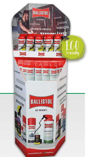 Butiksdisplay för Ballistolprodukter i hård kartong med två hyllplan.