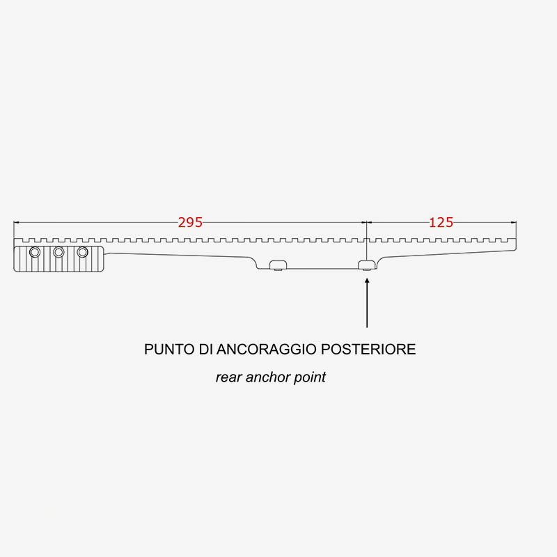 Snabbfäste (QD) i ett stycke i extra långt utförande (XXL) utrustat med en solid Picatinny-skena, kompatibelt med Blaser-studsare. Fästet använder Contessas patenterade snabbfästessystem som garanterar bibehållen inskjutning (return to zero) mellan varje montering och demontering.