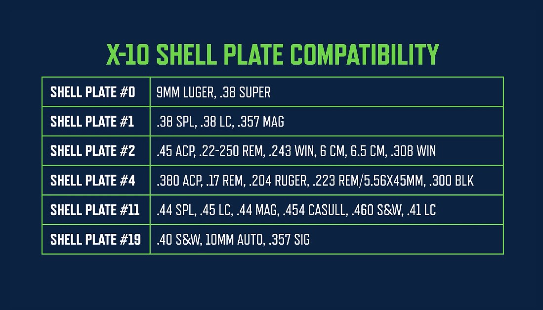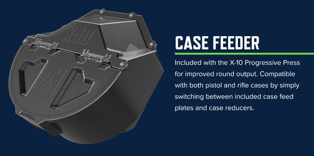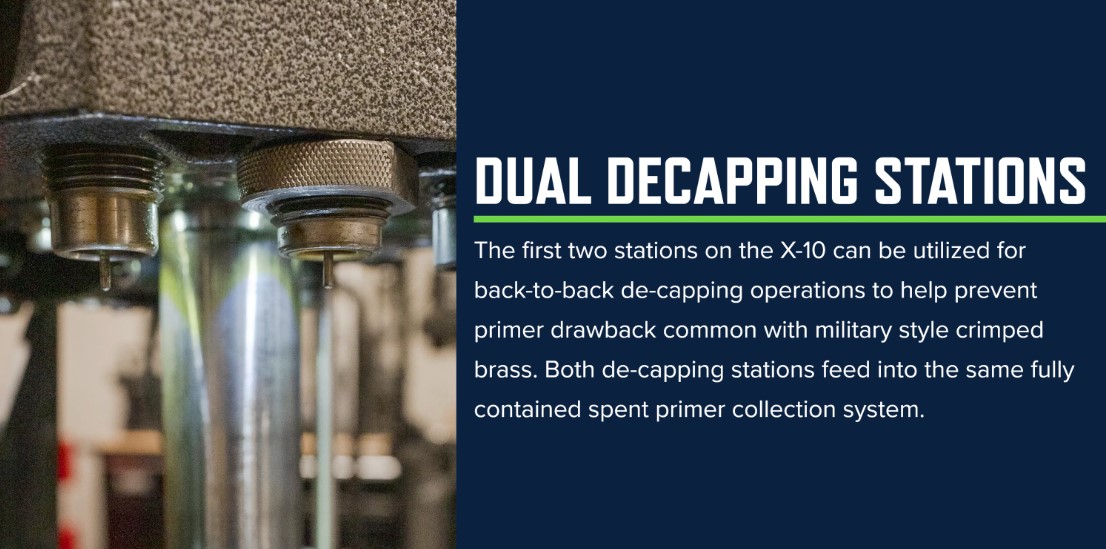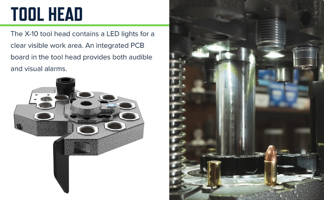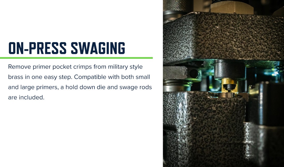 Integrerad Swaging-station: Som enda press i sin klass har X-10 ett inbyggt verktyg för att brotscha (swage) tändhattslägen för både stora och små tändhattar, perfekt för att hantera militära hylsor.