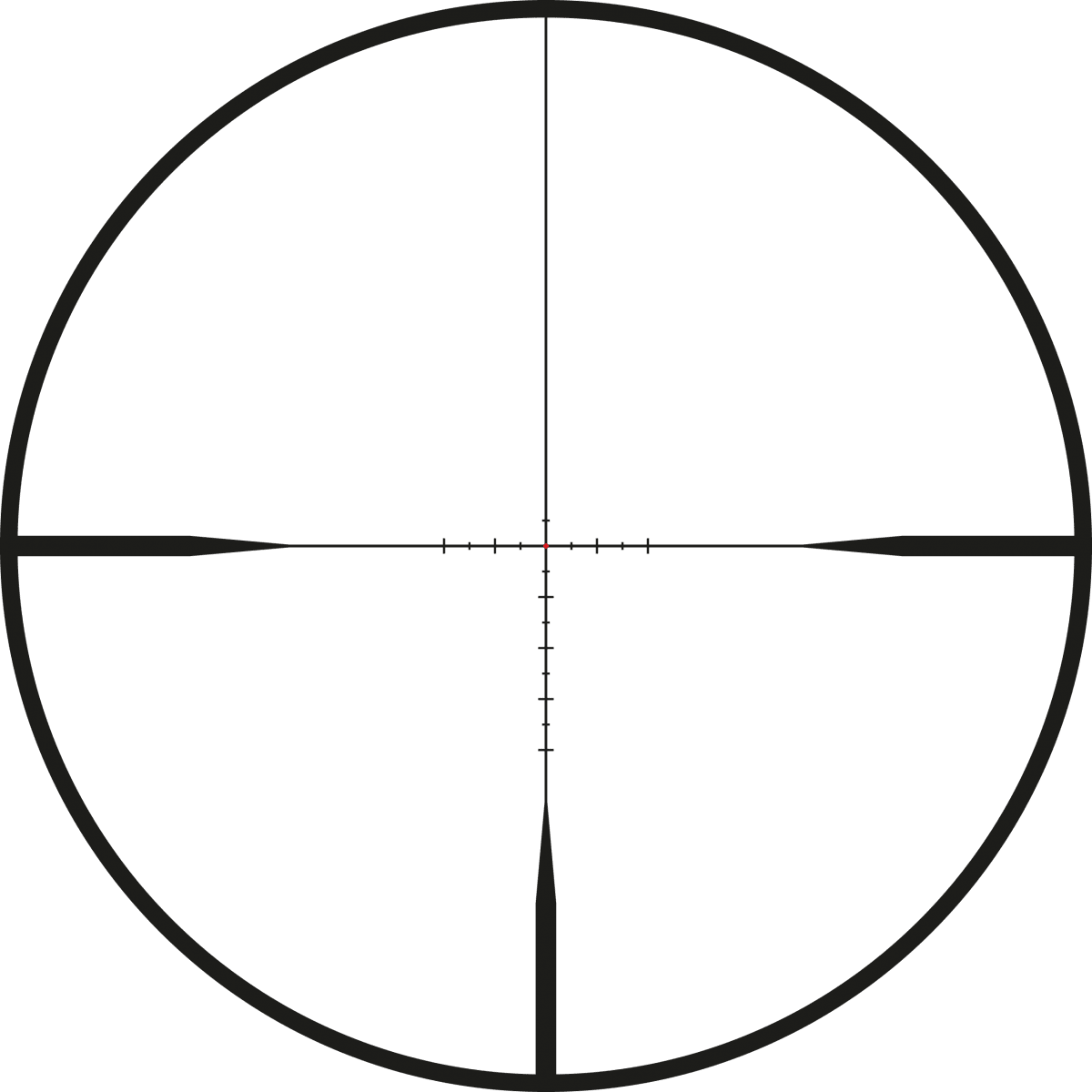 Mil riktmedlet stämmer vid 10x förstoring. Den ljusa fiberoptiska mittpunkten ger en skarp målpunktsreferens för snabbt målförvärv. De tjocka ytterposterna gör det lätt att se vid jakt i svagt ljus, och den tunna översta posten säkerställer att den inte blockerar din sikt på målet.