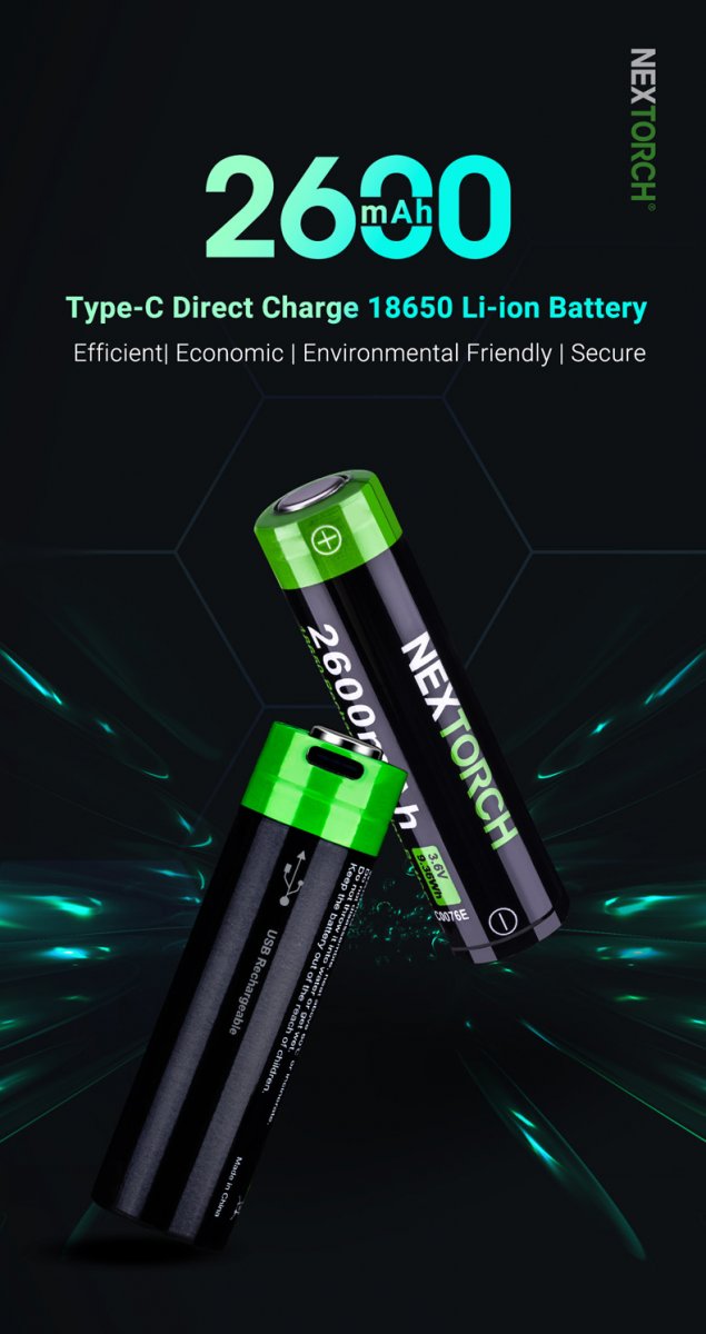 Nextorch uppladdningsbara batteri 18650 Li-ion laddas enkelt med USB-port mellan strömkällan och direkt till batteriet.
