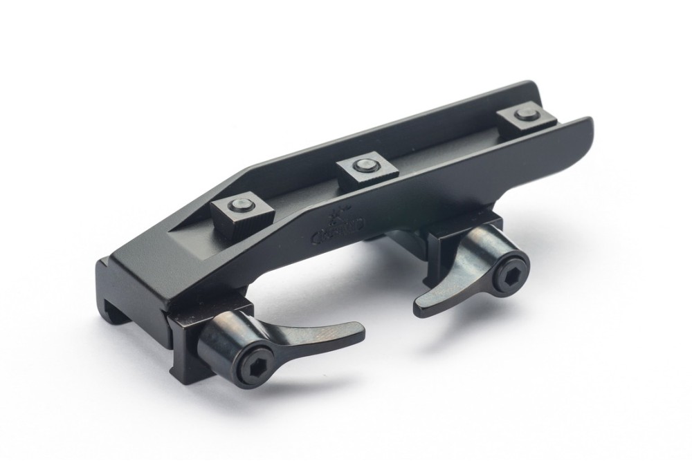 Snabbmontage för kikarsikte med Zeissskena på picatinny. Kikarsikten från Zeiss och Steiner för skenmontage använder Zeisstandard. Fästet är tillverkat i stål, hela fästet är i en enhet, ett så kallat sadelmontage, det monteras och demonteras utan verktyg.