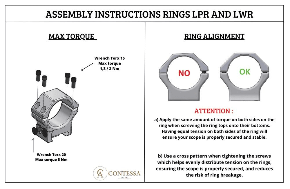 Contessa LPR, ringar för kikarsikte med tubdiameter 40 mm, superkvalitet frästa ur ett stycke solid aluminium. Superlätta och superstabila. Två skruvar Torx 20 i vardera ring för montage mot skenan, fyra skruv per ring i överfallen. Dubbla rekylklackar som kräver picatinnyskena enligt MIL-STD-1913. Se våra picatinnyskenor från Contessa, Rusan eller Warne. De passar även vapen med integrerad picatinny som är fräst eller på annat sätt sitter direkt i lådan.