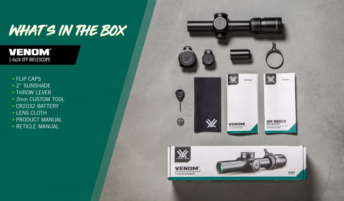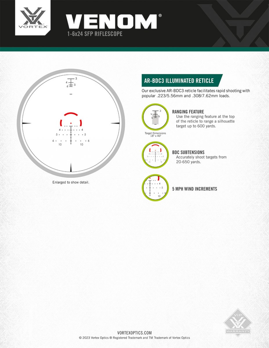 Hastighet, pålitlighet och precision kombineras i en hårt arbetande LPVO (Low Power Variable Optic) utformad som en instegsmodell till lågförstorande kikarsikten. Venom® 1-6x24 SFP erbjuder äkta 1x-6x förstoring och ett AR-BDC3 riktmedel för precisa skott på kort till medellångt avstånd.