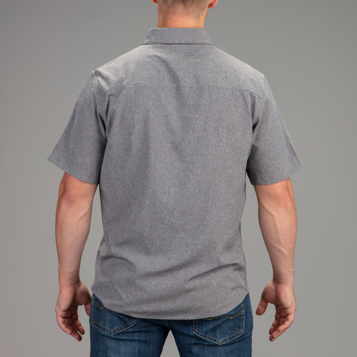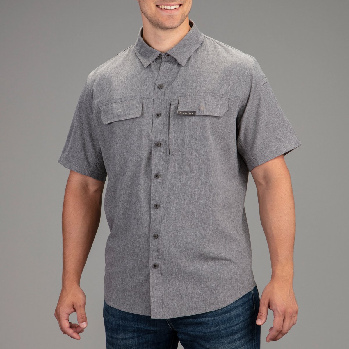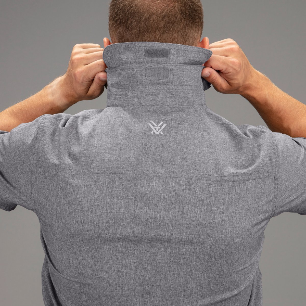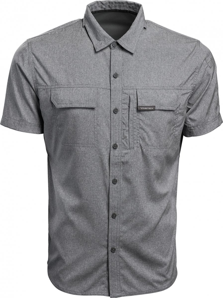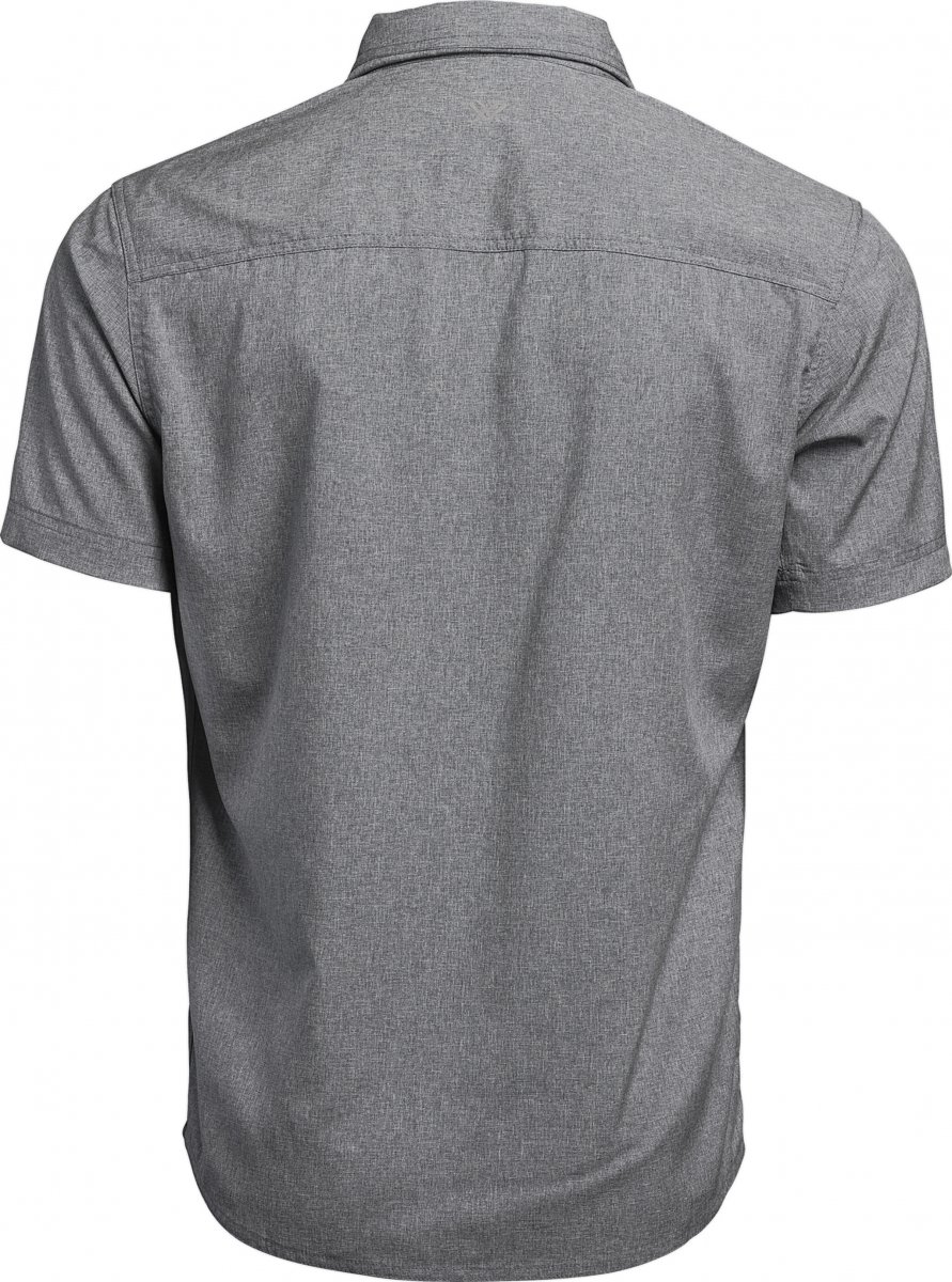Snygg skjorta för alla tillfällen med två bröstfickor, dold ficka med blixtlås, utrustad med inbyggd putsduk i nedre inre framkant på skjortan. Kragen hålls på plats med dolda knappar och kragen har även ett uppvikbart solskydd i nacken.