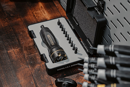 Wheelers digitala FAT Wrench ger dig en mer exakt momentinställning än den manuella momentdragaren genom både hörbar och visuell indikator. Det medföljer tio stycken bitsar i den medföljande förvaringslådan.