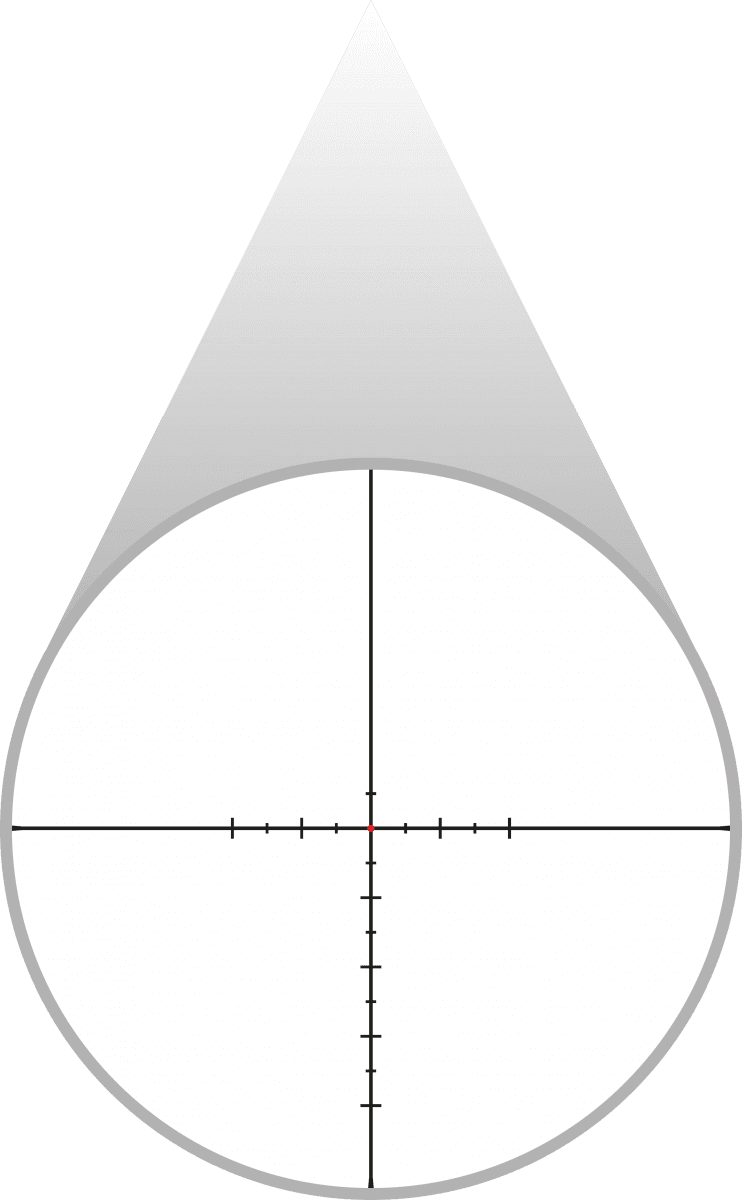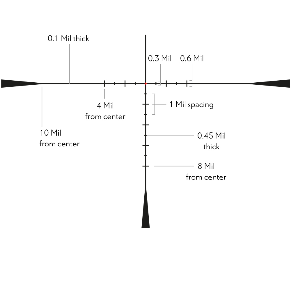 Mil riktmedlet stämmer vid 10x förstoring. Den ljusa fiberoptiska mittpunkten ger en skarp målpunktsreferens för snabbt målförvärv. De tjocka ytterposterna gör det lätt att se vid jakt i svagt ljus, och den tunna översta posten säkerställer att den inte blockerar din sikt på målet.